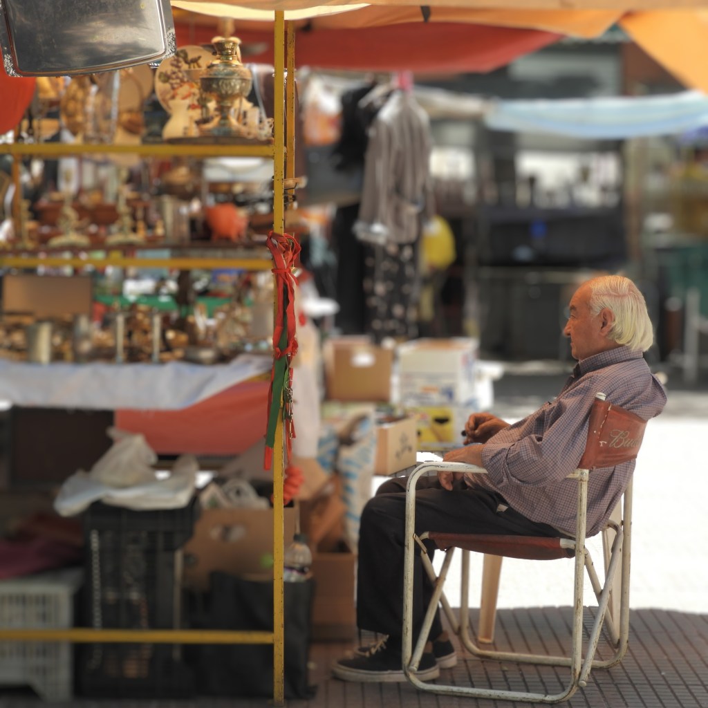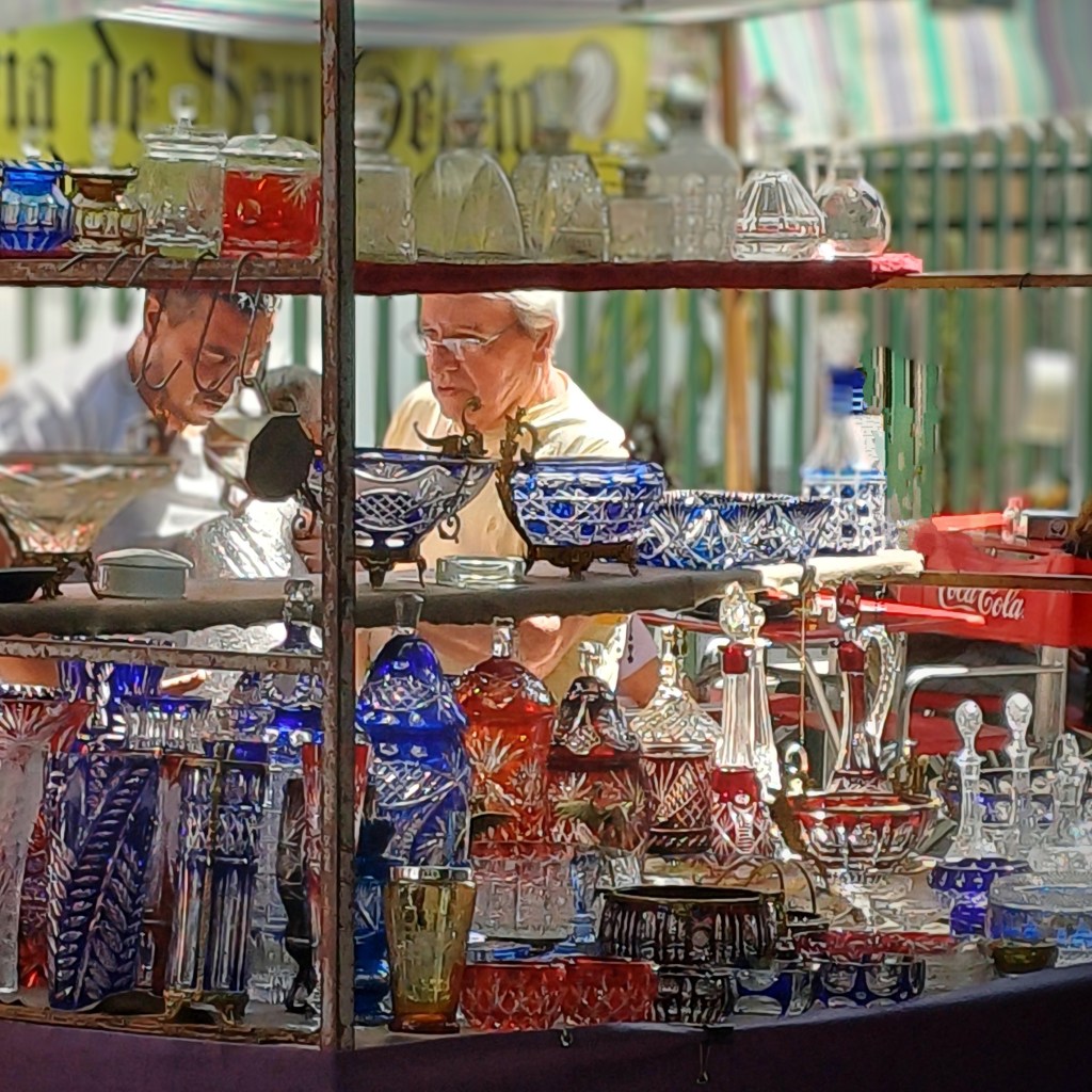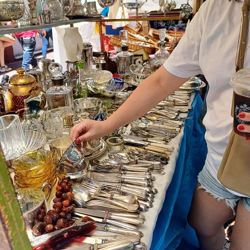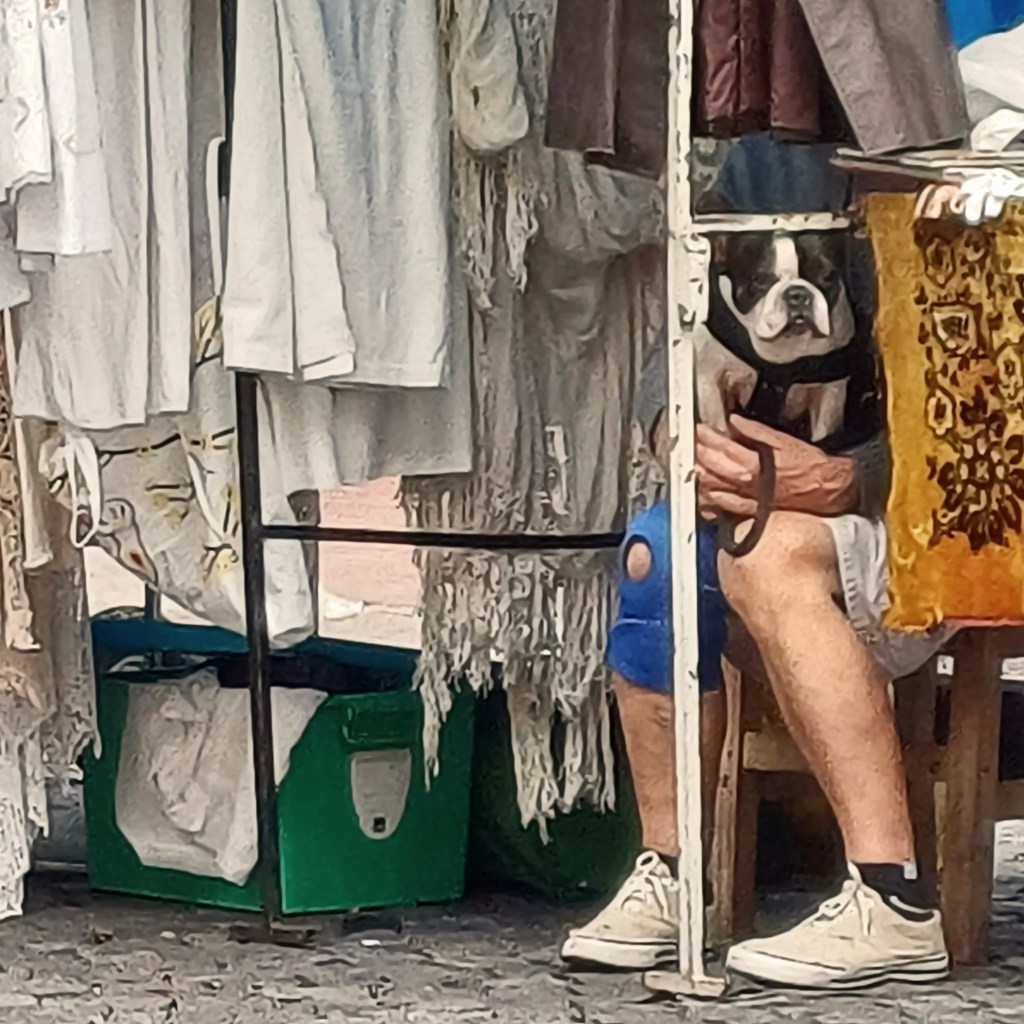 Scoring a table at one of the outdoor cafes surrounding the plaza is like hitting the jackpot. A feast of people-watching. ‘Awesome’, I hear an American say, as he picks up a sword and unsheathes it from it’s scabbard. I wonder what he’d do with it. So does he apparently, because it puts it down reluctantly. I watch a woman try on a fur stole and twist and turn in front of the oval mirror of a stall nearby. It too returns to its hanger. Stall-holders sit on deck-chairs, chat, drink mate, and wait. A French bulldog with a characteristically grumpy face peers out from underneath antique lace tablecloths. The buyer must be out there somewhere.