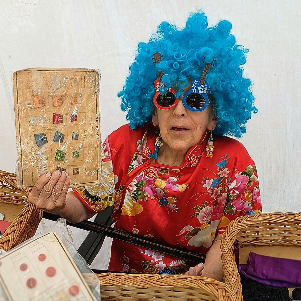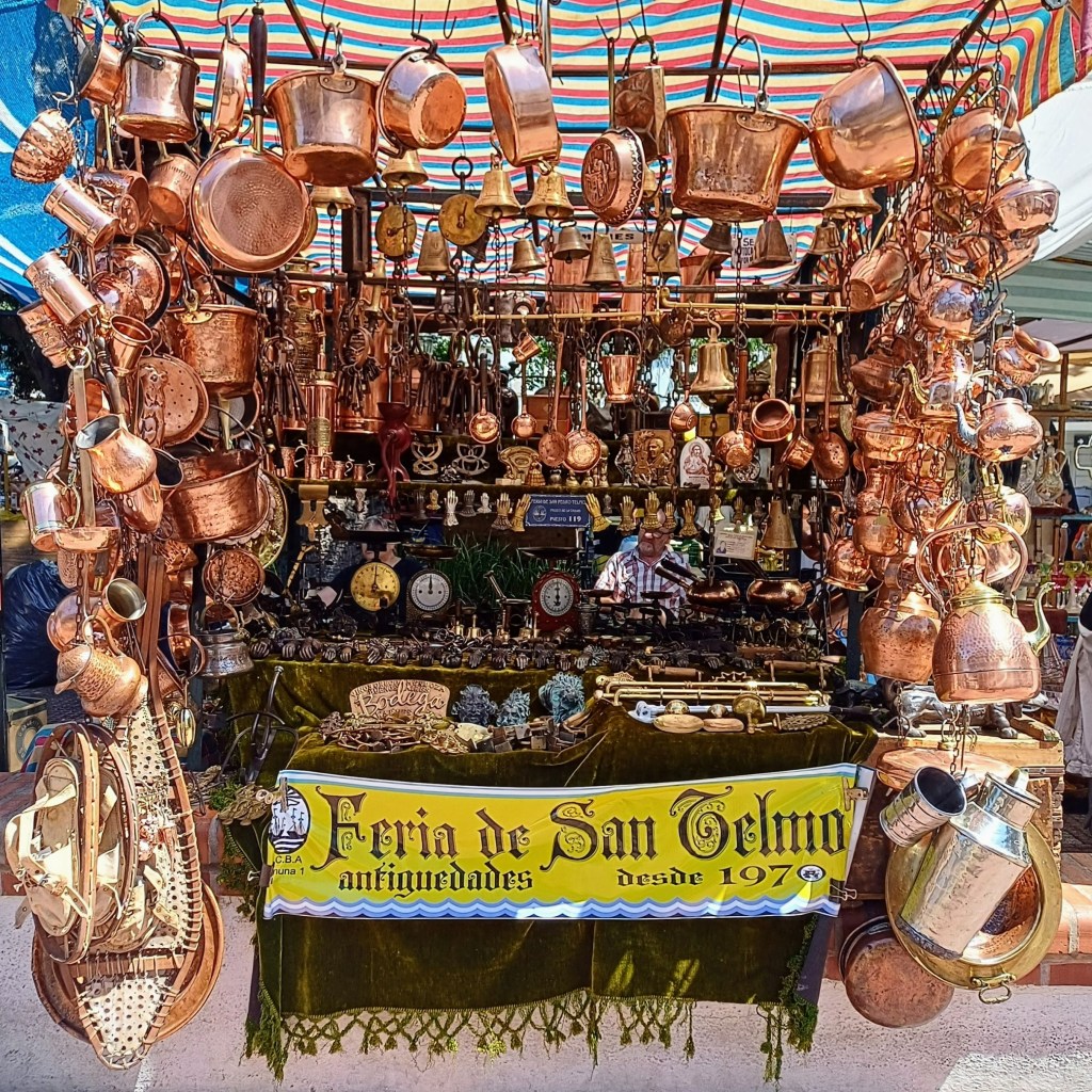 The feria began in 1970 with just a handful of stalls, an attempt to save the area from re-development. Now the antique market takes over Plaza Dorrego and artisan stalls  the surrounding cobble-stone streets, for several blocks. Bandoneon players, tarot-card readers, simit sellers, orange-juice and sugared-peanut sellers – anything goes. One man sells whistles that imitate bird song. There are floral tea-services, box cameras, coloured glass, old magazines, brass, clothing – vintage, knitted and new, knitted outfits for Barbie dolls, Messi football shirts for babies, jewellery, musical instruments – the list is endless. One of my personal favourites was an old lady with a blue, curly wig who had a whole stall full of nothing but buttons.
