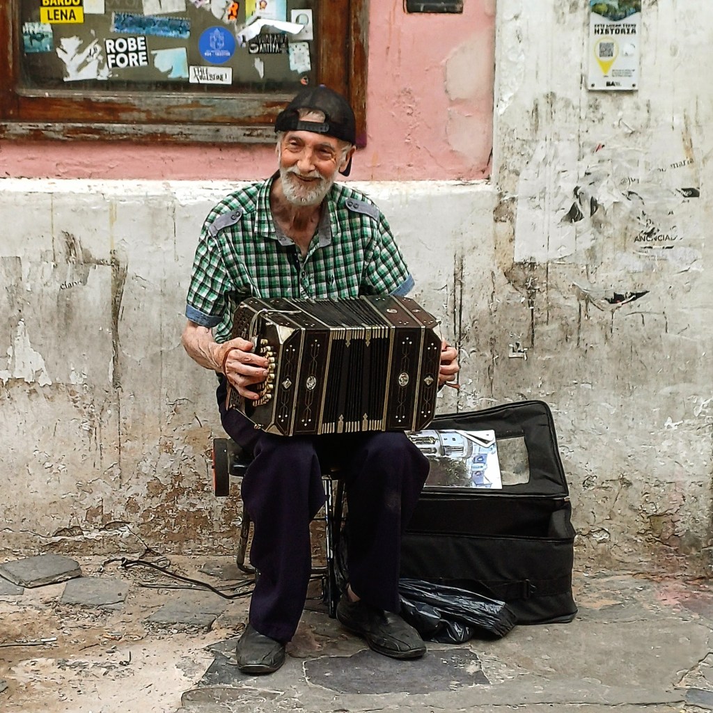 I smell fresh oranges, cooked meat, and incense. I hear those bird whistles and notes of tango music. There are performers inside the cafe and in the plaza. This is a city of music and dance. I can’t see the performers, but I don’t want to give up my chair, so while the streets heave around me, like the stall holders and the French bulldog, I sit and wait and drink it all in.