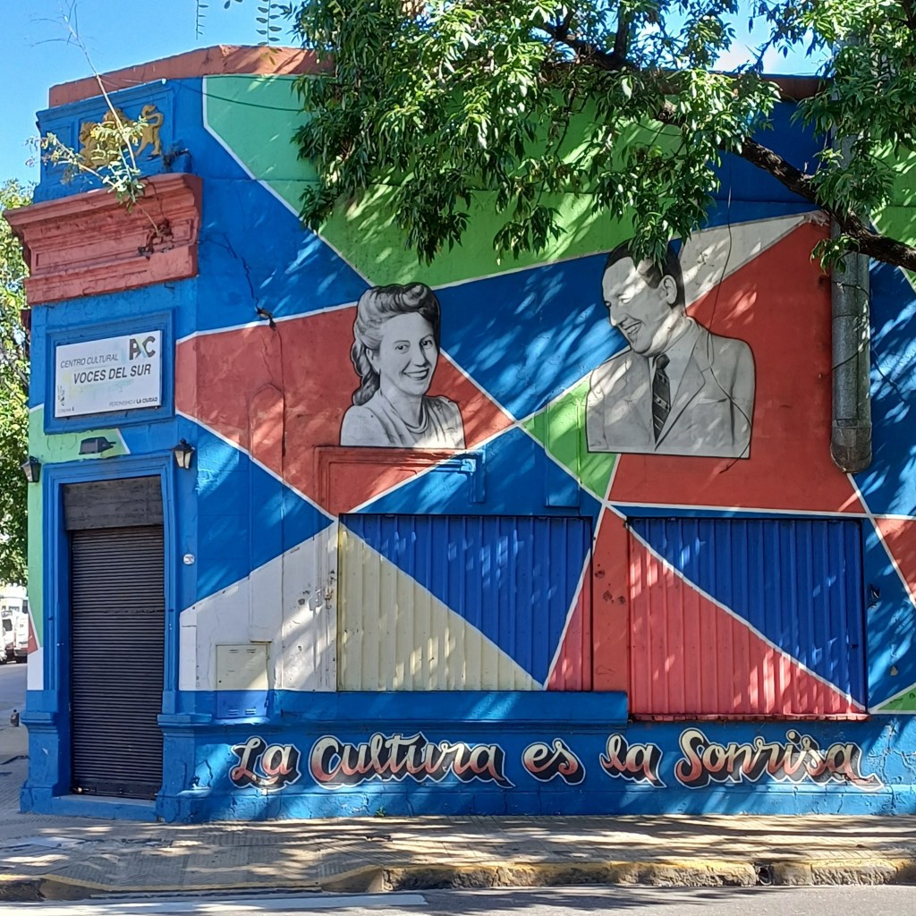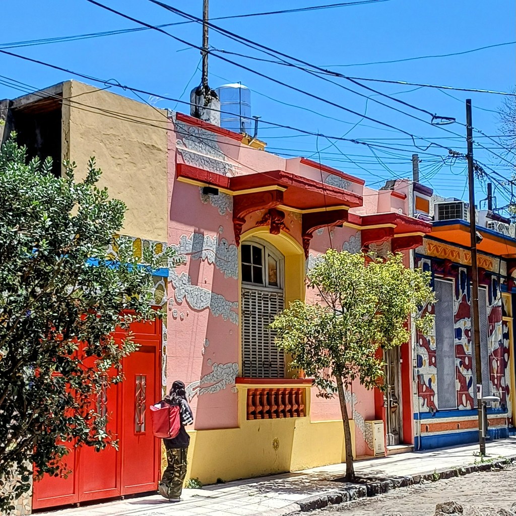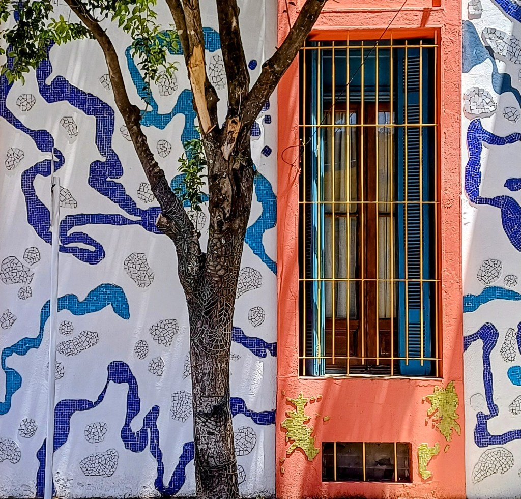 Eventually, we started our walk for real. Down streets where a handful of nineteenth-century buildings jostled for space with high-rise living blocks. And then we hit Passage Lanin, where ordinary houses have become works of art. Calle Lanin itself was dug up. Huge cobblestones (they are a bit like icebergs when you see them unearthed) lay in heaps and it was a mass of sand and rubble. Even so, I could not stop the smile spreading over my face. A workman snoozed in his digger and his muchachos sat in the shadow at the end of the street. I ignored the mess and concentrated on the colour. Local artist Marino Santa Maria decorated his own studio with mosaic tiles in 1990. His neighbours liked it so much they asked him to transform their own homes and they did it together, each one different, each an expression of the people living inside. The city government got on board, and the Museo de Bellas Artes and Unesco, and eventually 35 houses over two blocks were a riot of stripes, wavy lines and wobbly dots. Yellow and royal blue, orange and pink, turquoise, bottle-green and burgundy, all mingling with the natural colours of sky and trees. It was a riot and I was on a natural high.