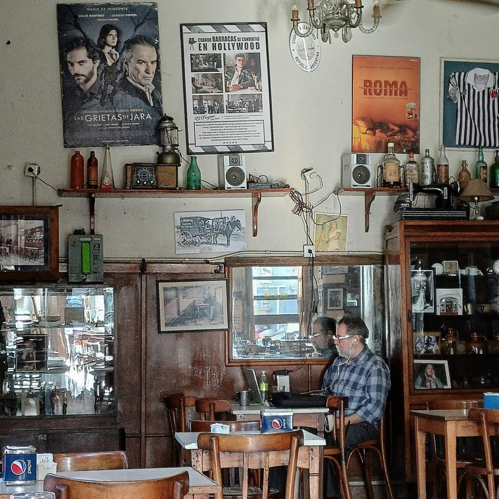 High drama! We needed to sit down, and as we always begin a walk with a coffee stop, we headed across Plaza Columbia (the site of Felicitas’s former home) to Cafe Martinez. ’90 years of shared stories and we are going for more’ proclaimed the window sign. That’s my idea of a cafe, the store-cupboard of a community, a magpie-like collection of bits and bobs of local history and tales, a place for people to congregate and chat. The girl on the counter seemed unaware of the widow sign and could not even summon a smile; still the medialunas were good and the coffee hot, and we people-watched for a while. Content.