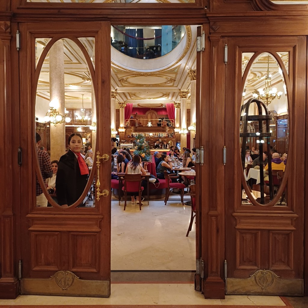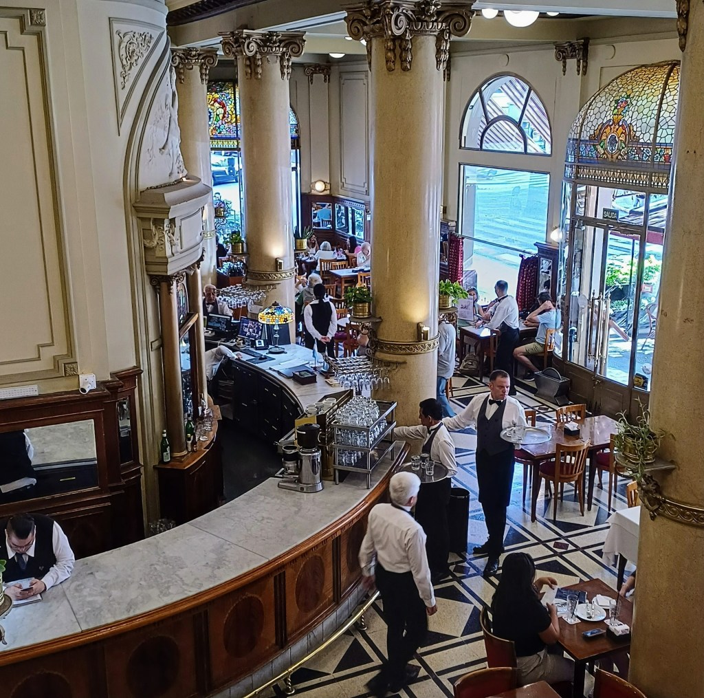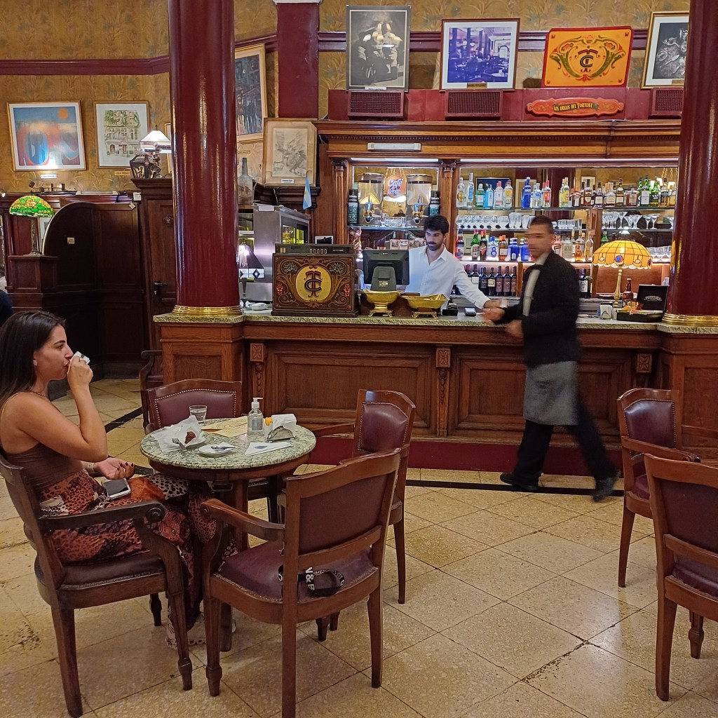 The most famous Notable of all is Cafe Tortoni. (It’s the fourth most visited site in Buenos Aires). My inclination nowadays is to ignore those ‘must see’ places. We’d read about the queue to get in and thought ‘why bother?’. But something niggled. Fear of missing out, I guess. So, not expecting much, but feeling we should, one morning we went and stood in line. It was not a huge line, and it moved quickly enough to give us hope that the wait wouldn’t be too hard on Jim’s creaking knees.