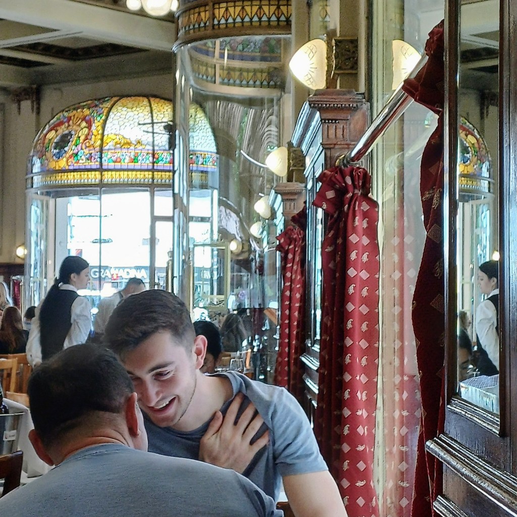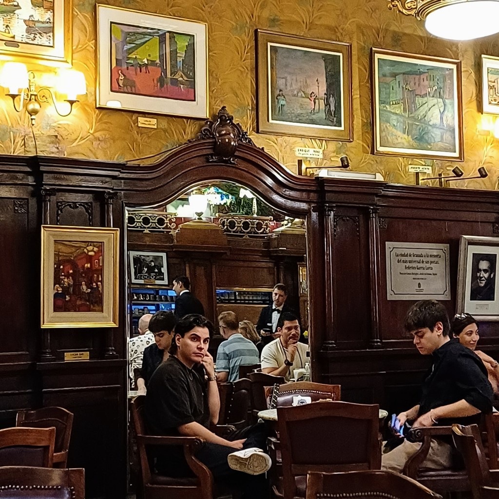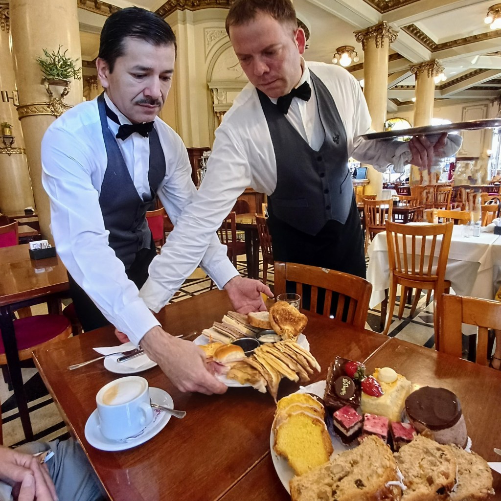 The most famous Notable of all is Cafe Tortoni. (It’s the fourth most visited site in Buenos Aires). My inclination nowadays is to ignore those ‘must see’ places. We’d read about the queue to get in and thought ‘why bother?’. But something niggled. Fear of missing out, I guess. So, not expecting much, but feeling we should, one morning we went and stood in line. It was not a huge line, and it moved quickly enough to give us hope that the wait wouldn’t be too hard on Jim’s creaking knees.