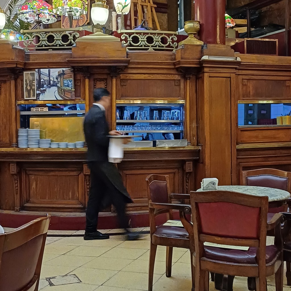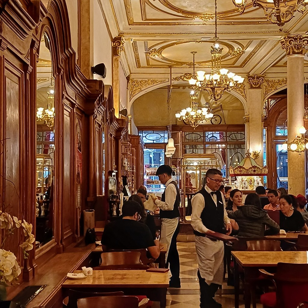 We were in! Threading our way through original, dark-oak, marble-topped tables, skirting ox-blood red columns and admiring artworks and Tiffany lamps. We ordered cafe con leche and sat back. A tiny kitchen was hidden under a great curve of wood. Staff offloaded dirty crockery, glasses and cutlery, leant against it to chat, use their phones, grab a drink, or wait while their trays were filled with orders. It was the eye of the storm. A pinprick of calm, in a tornado of activity. One bow-tied waiter directed the rest, a conductor of his own orchestra. Waiters here hum and memorise orders, it’s a point of honour not to write them down. It’s not only architectural heritage that notables preserve – it’s tradition, part of the ingrained culture of the city.